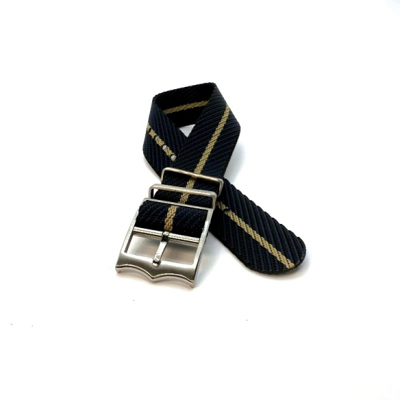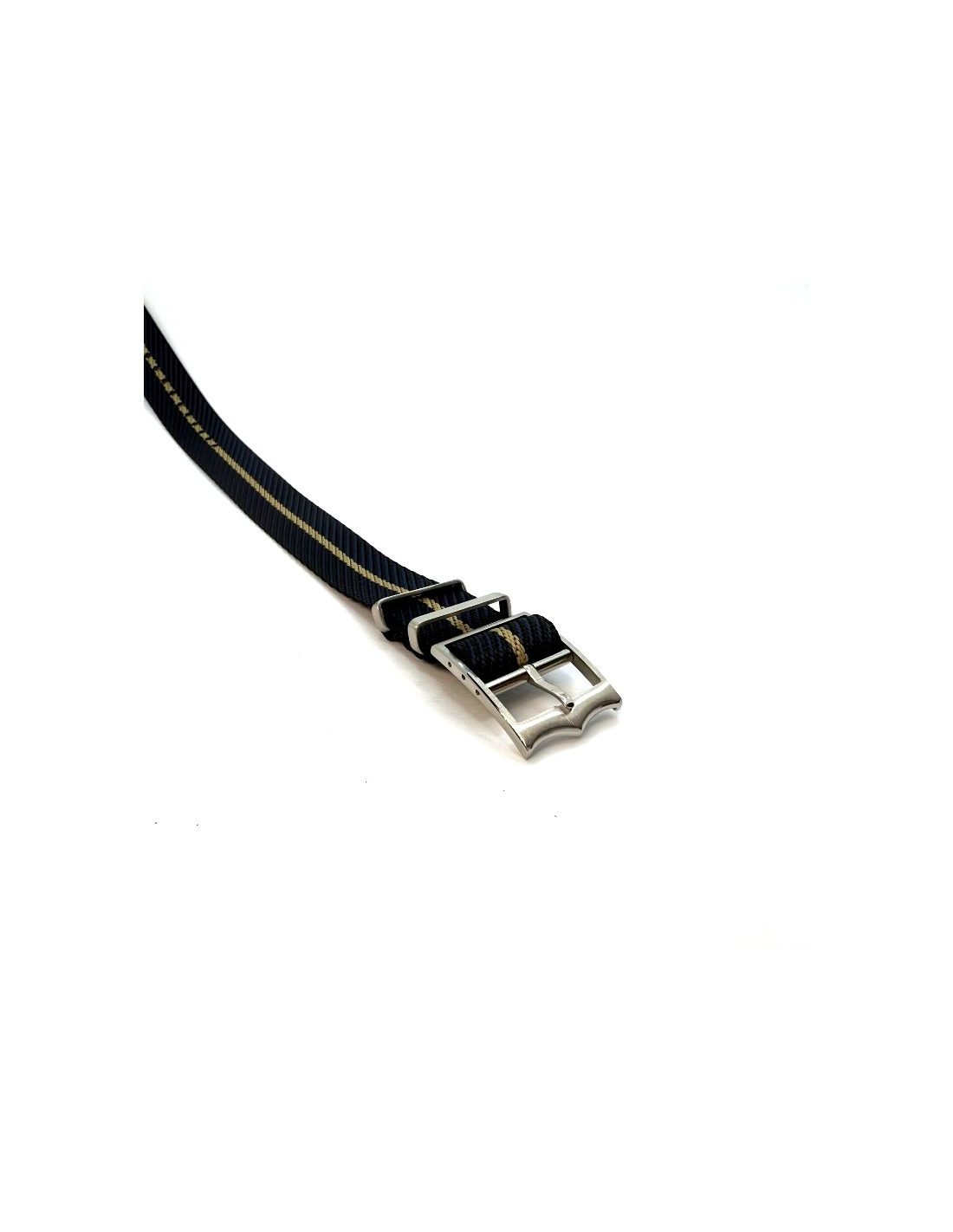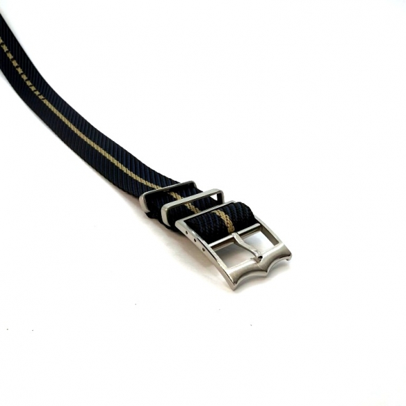 Cureaua Tudor in nuante de negru, bleumarin si dunga centrala khaki este realizata din material textil rezistent la apa, oferind durabilitate si confort. Prinderea simpla pe sub ceas si catarama tip crown buckle asigura o fixare sigura si un aspect rafinat.