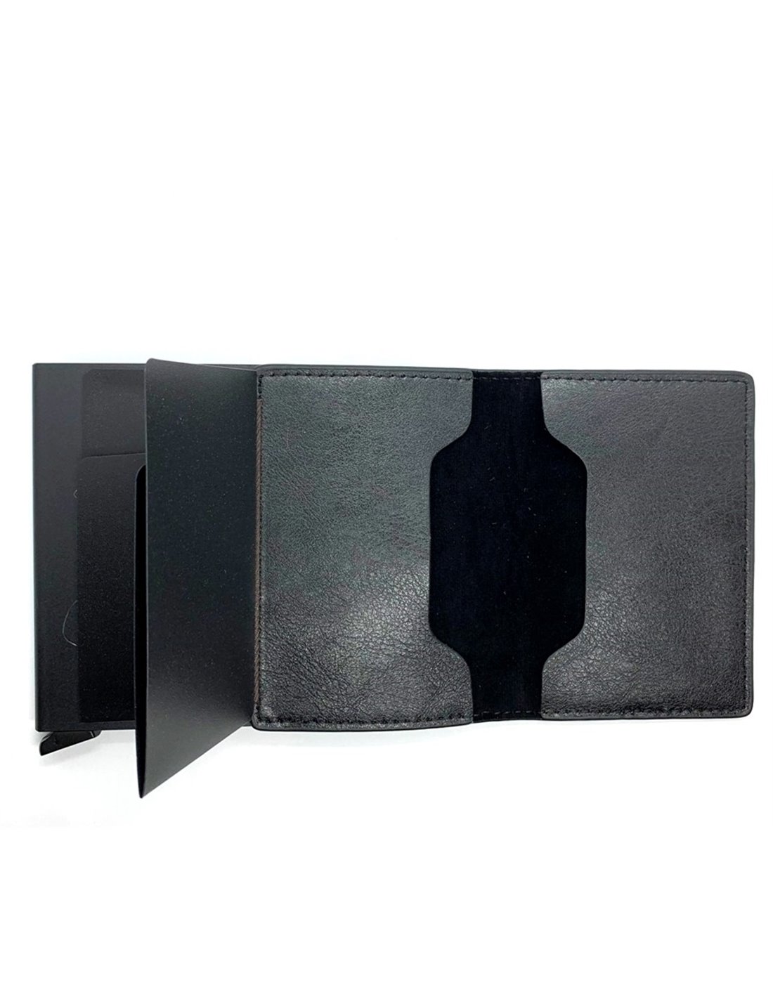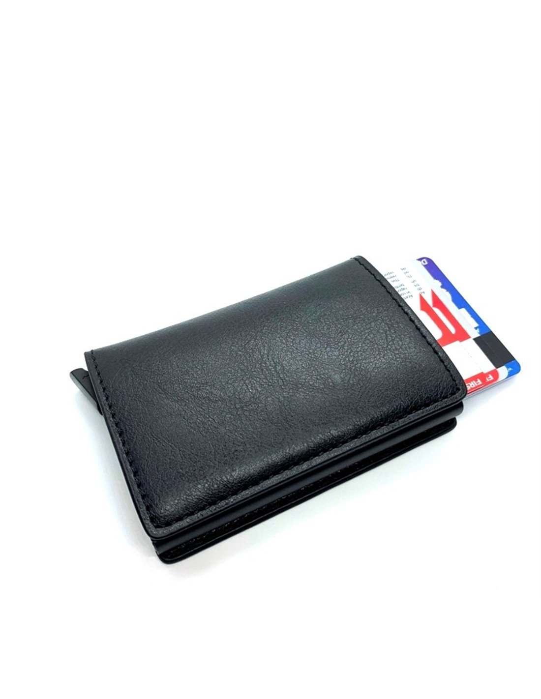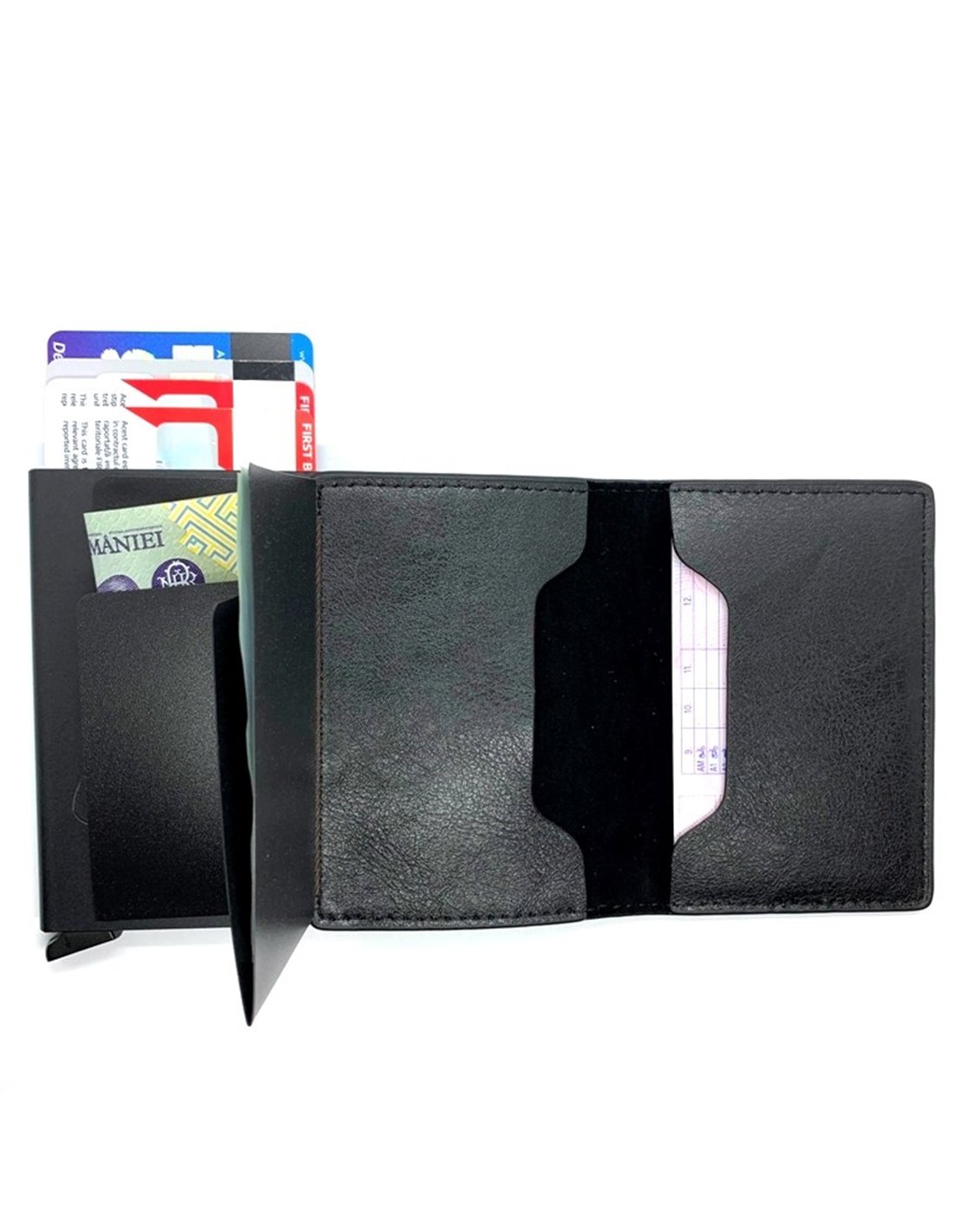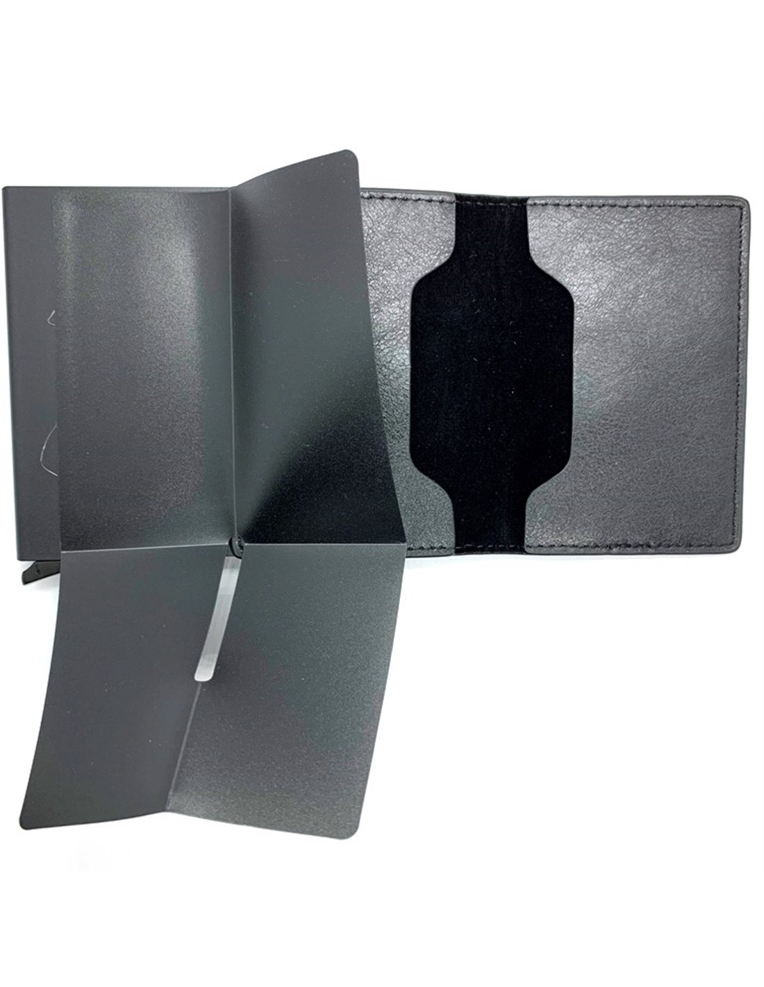 Suport carduri metalic minimalist imbracat in piele ecologica neagra.