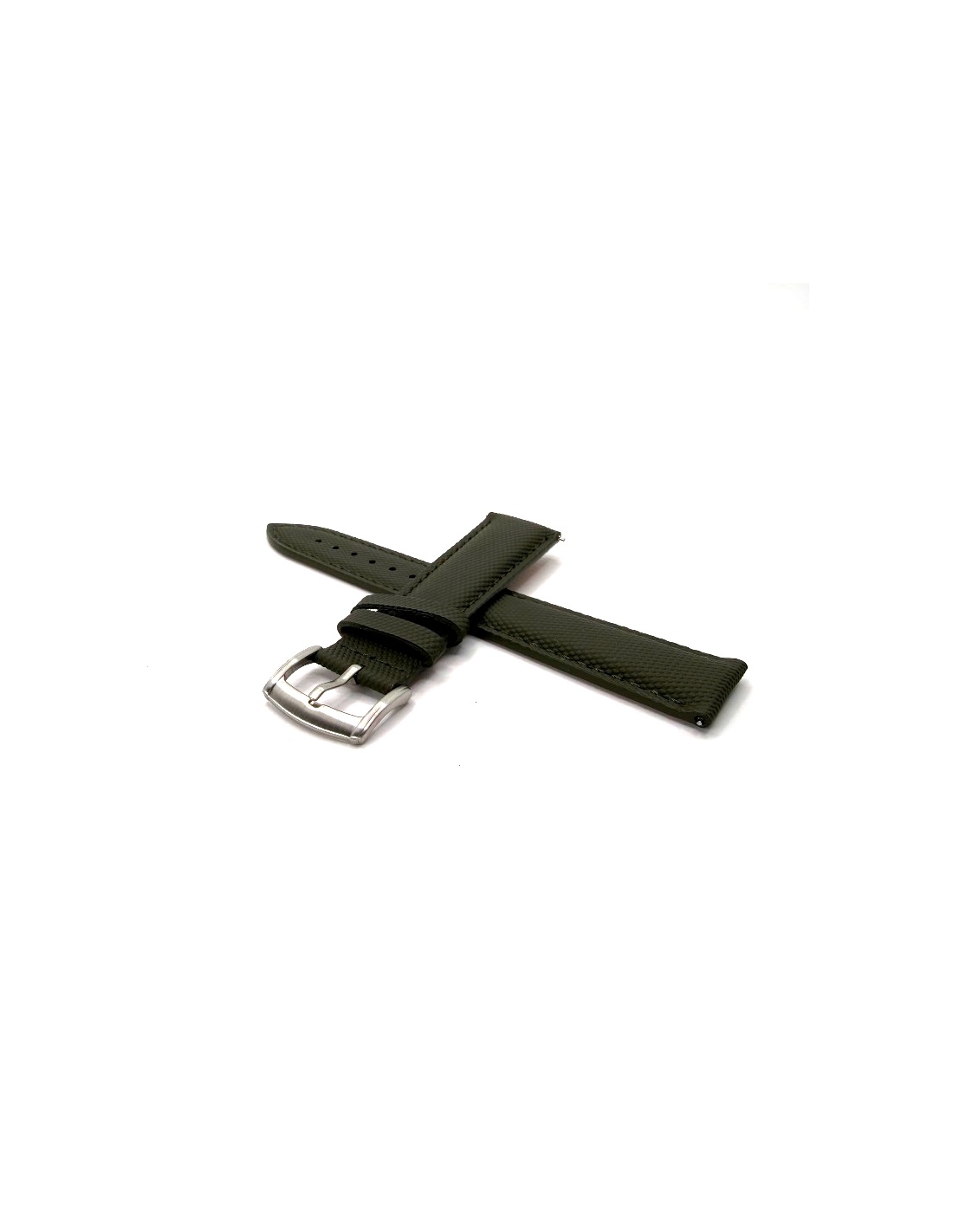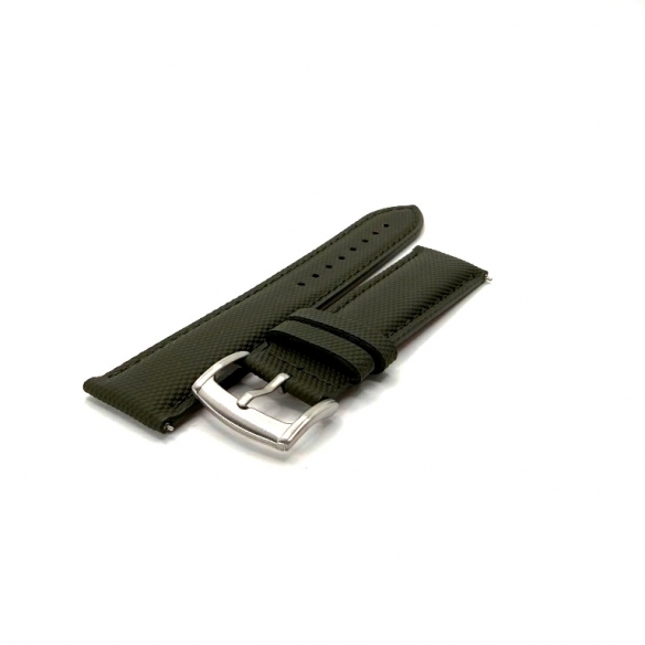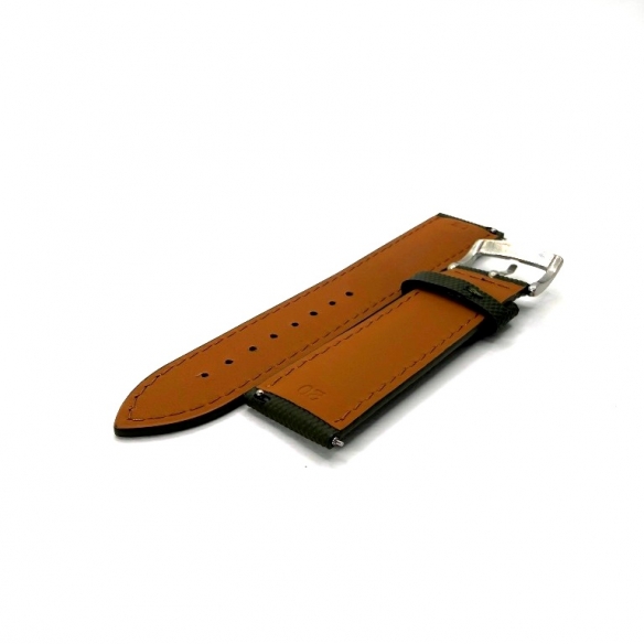Cureaua sailcloth verde inchis dublata piele imbina rezistenta materialului textil exterior cu confortul pielii naturale la interior. Exteriorul din sailcloth are o nuanta verde inchis cu tenta gri, oferind un aspect sobru si modern, potrivit pentru ceasuri sport sau casual. Interiorul din piele naturala maro asigura confort.